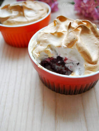 Białka ubić ze szczyptą soli na pianę. W połowie ubijania wsypywać cukier wymieszany z proszkiem kisielowym. Dodać łyżkę soku wiśniowego, zmiksować na sztywną pianę. Przykryć nią śliwki.