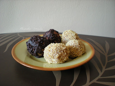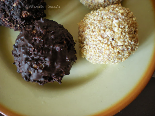 Właściwie powinnam napisać – podwójnie amarantusowe. Użyłam bowiem ziaren amarantusa ugotowanych na mleku razem z kaszą manną oraz amarantusa ekspandowanego, do obtoczenia tych małych kuleczek. Muszę powiedzieć, że efekt tego kulinarnego eksperymentu przerósł moje oczekiwania. Nie dość, że zdrowe i naprawdę sycące, to jeszcze takie smaczne, że żałowałam, że wyszło mi tylko 5 sztuk… Bardzo polecam. I radzę od razu zrobić wszystkie w polewie czekoladowej.. 😉