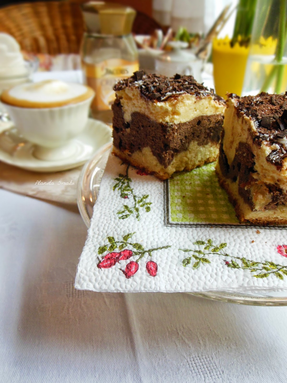 Masę wyłożyć na ostudzone ciasto, wyrównać. Udekorować polewą czekoladową. Wstawić do lodówki na przynajmniej kilka godzin.
