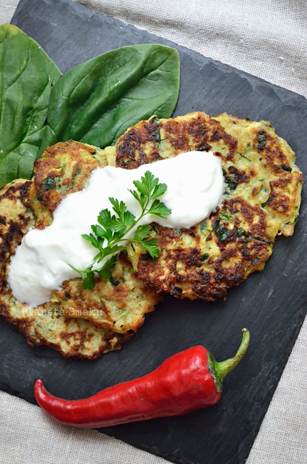 Placki z cukinii to bardzo wdzięczne danie – można do niego bowiem dodać mnóstwo różnokolorowych warzyw, ziół czy przypraw, za każdym razem wyczarowując nowy smak tej potrawy. Tym razem postawiłam na zieleń – zielone cukinie, zielony szpinak, zielony szczypiorek. Do tego kremowa i delikatna ricotta skontrastowana z odrobiną świeżej papryczki chilli. Uwaga! Najlepsze i najbardziej chrupiące są tuż po usmażeniu, nie zwlekajcie więc i do dzieła!