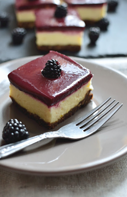 Kroić na kwadraty, ozdobić jeżynami i podawać.
