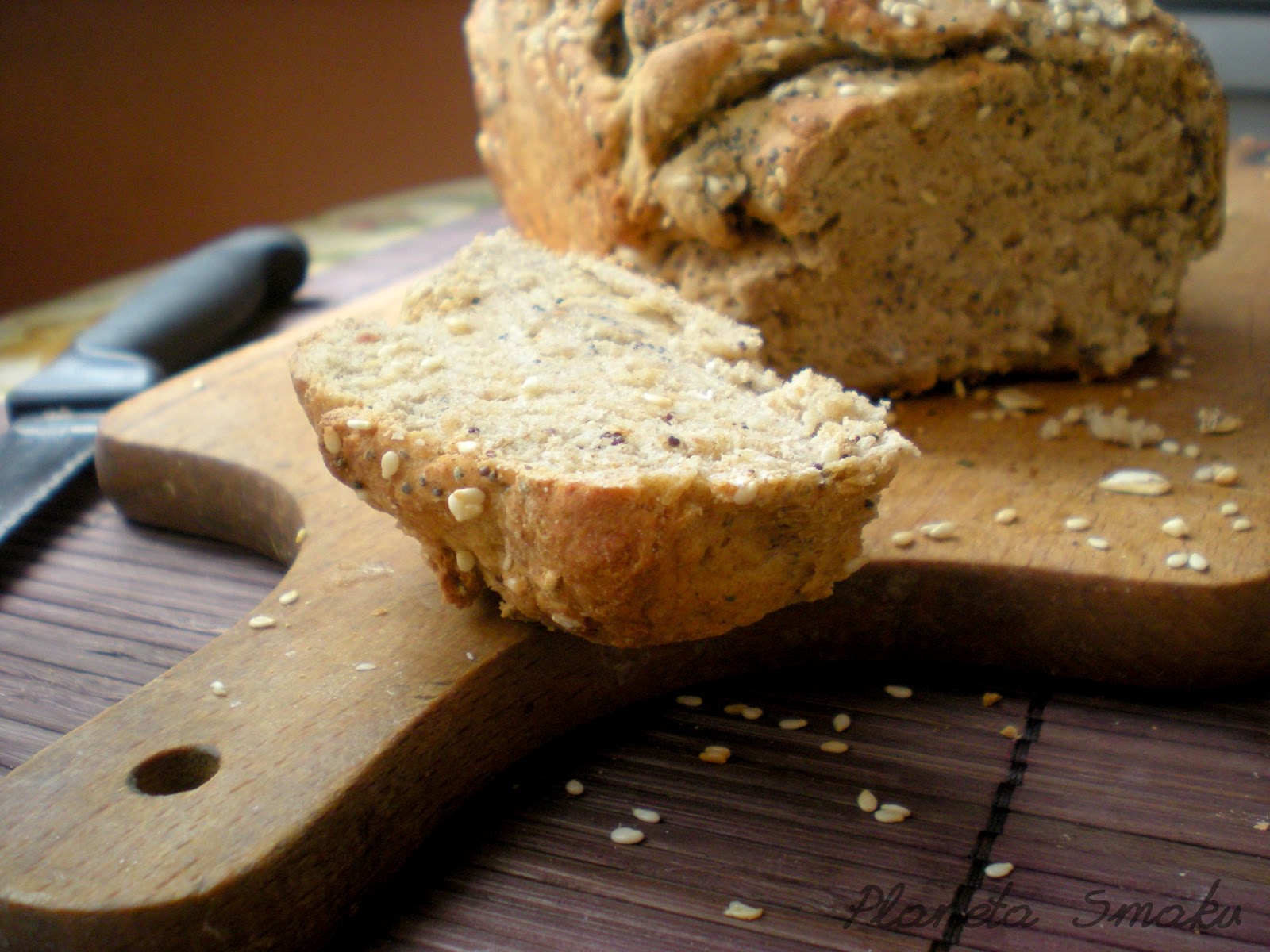 Uwielbiam zapach i smak domowego pieczywa. To nieprawdopodobne, o ile bardziej smakuje taka kanapka z własnoręcznie upieczonym chlebem. Ten chleb jest jednym z najprostszych rozwiązań, jeśli chcemy zabawić się w piekarza 🙂 Na drożdżach, posypany ziarnami i z garstką tych ziarenek także w samym cieście. Bardzo smaczny. Polecam!