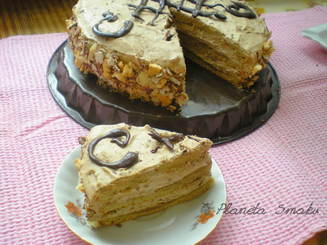 Lekki (nie mylić z niskokalorycznym! :)), nie za słodki i nie mdły. Przełożony masą z serka mascarpone, bitej śmietany, czekolady i kawy. Przyznam, że to taki mój eksperyment. Gdy zobaczyłam ten tort, zapragnęłam go zrobić. Jednak w trakcie pieczenia, zdecydowałam się na moje modyfikacje co do masy. Nie zawiodłam się, wyszła dokładnie taka, jaką chciałam.