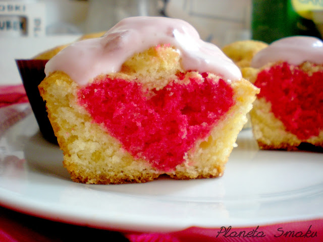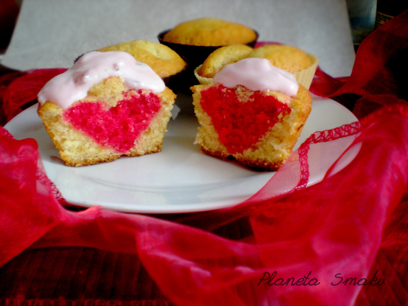 Z okazji wczorajszego Dnia Chłopaka postanowiłam upiec te babeczki. Bardzo mi się one spodobały i wydały odpowiednie na takie święto. Z drżącym sercem wyjmowałam je z piekarnika, bo wiadomo, że jeśli coś ma być prezentem, to nie można popełnić żadnego faux pas. Na szczęście zapamiętałam, w którym miejscu trzeba je przeciąć, więc nie było żadnej wpadki 😉 I nawet jeśli moje serduszka są trochę koślawe, to jestem zadowolona. Mojemu chłopakowi prezent także się spodobał, a to najważniejsze. W końcu włożyłam w nie całe swoje serce… 🙂