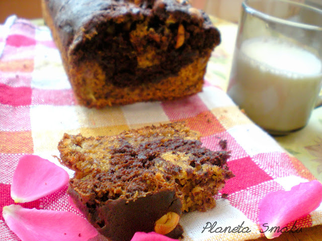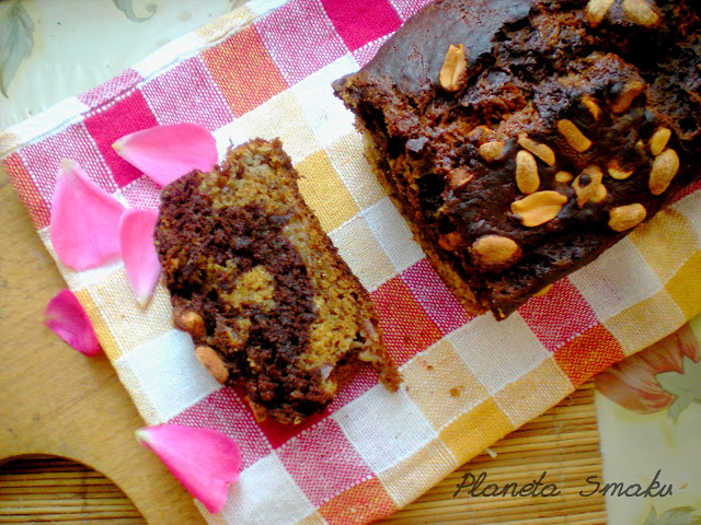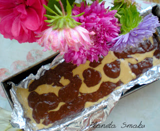 Do keksówki wyłożonej papierem do pieczenia wlać po trochę jasnego, a następnie trochę ciemnego ciasta, robiąc łaty. Zrobić „esy-floresy”, używając wykałaczki. Można dodatkowo posypać ciasto płatkami migdałowymi lub orzechami.