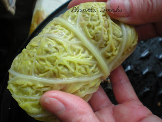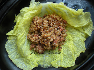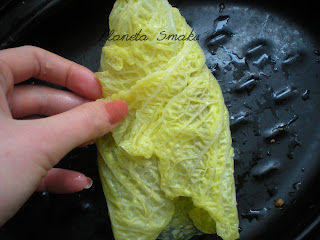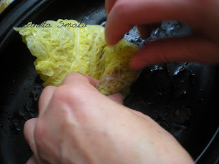 Na środku każdego liścia kapusty nałożyć 2 łyżki farszu, zawijać, jak pokazałam na zdjęciach: