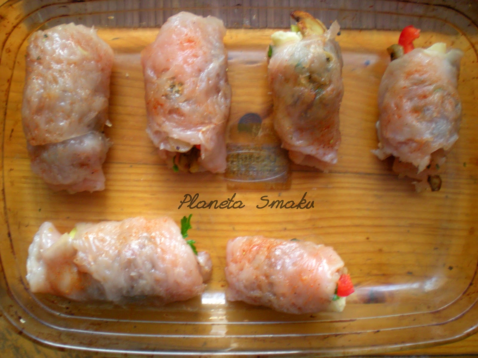 Zwijać ciasno w roladki. Ułożyć w naczyniu żaroodpornym, zapiekać w piekarniku nagrzanym do 180 stopni przez 25 minut.