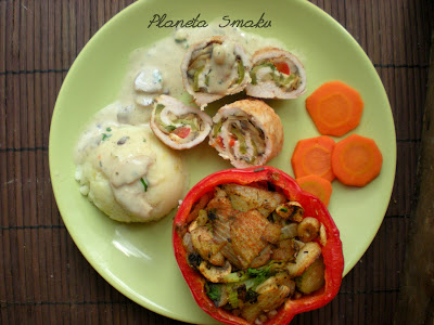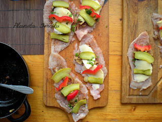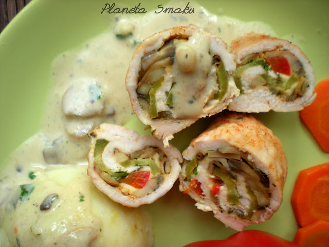 Kolorowe roladki z kurczaka dość często goszczą u mnie na obiad. Piersi z kurczaka w postaci roladek znają chyba wszyscy, ja moje prawie zawsze nadziewam serem, pieczarkami, papryką i ogórkiem. I zapiekam w piekarniku, nie smażę. Polecam wszystkim tym, którzy chcą zjeść smaczny, zdrowy i kolorowy posiłek.