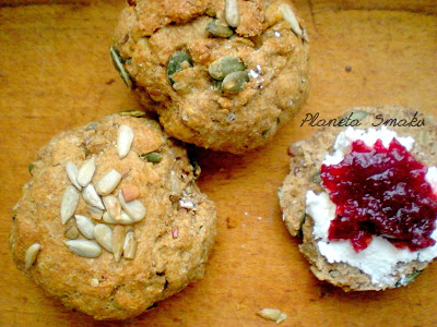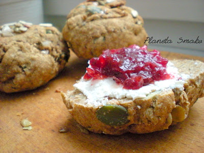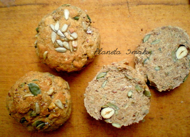 Patrzę na nazwę posta i zastanawiam się czy „pełnoziarniste z ziarnami” nie brzmi trochę jak „masło maślane”… Ale po chwili dochodzę do wniosku, że nazwa ta dobrze pasuje do bułek, które tym razem przygotowała moja siostra 🙂 Są pyszne! Jeśli lubicie pełnoziarniste pieczywo, koniecznie spróbujcie. Możecie wzbogacić je dowolnymi ziarnami, pestkami dyni, sezamem, makiem… Ja w swojej bułce, po przekrojeniu, znalazłam nawet orzecha laskowego (co zresztą możecie zobaczyć na zdjęciu. Dzięki, siostra 😀 ). Bułeczki są lekko słodkie, dzięki dodatku miodu, stąd lepiej komponowały mi się z twarożkiem i dżemem, aczkolwiek jadłam je również z żółtym serem i szynką i też mi smakowały 🙂 Przepis na podstawie tego, wzbogacony przez siostrę o pestki dyni.