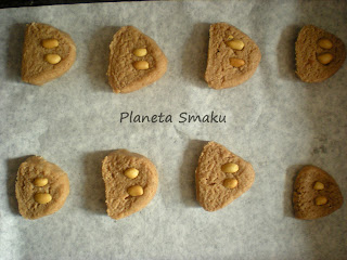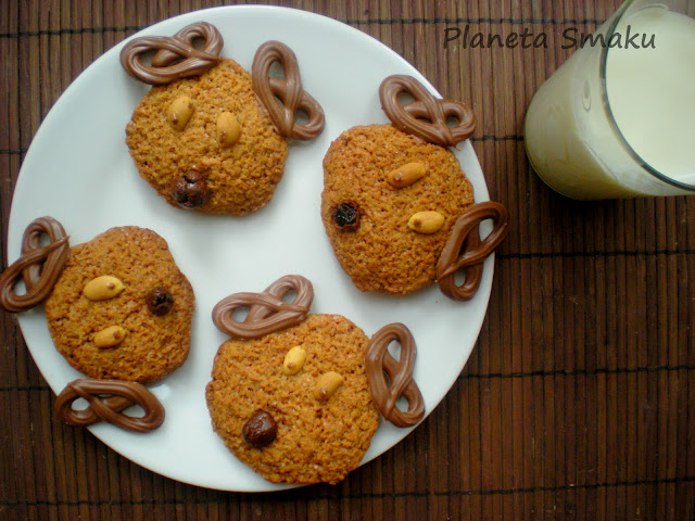 Piec przez 20 minut w temp. 170 stopni. Upieczone ciastka wyjąć z piekarnika, ostudzić. Gdy wystygną, maczać jedną stronę czekoladowych precelków w rozpuszczonej czekoladzie i przykładać po bokach ciasteczka, jako rogi. Na każdym orzeszku zrobić także kropeczkę z czekolady jako oczy.