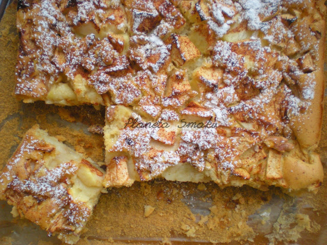 Ciasto przelać do formy wyłożonej papierem do pieczenia (ok.22x34cm). Równomiernie wyłożyć na nie jabłka, posypać orzechami i cynamonem. Ja dodałam także niedużą garść rodzynek, namoczonych wcześniej w rumie.