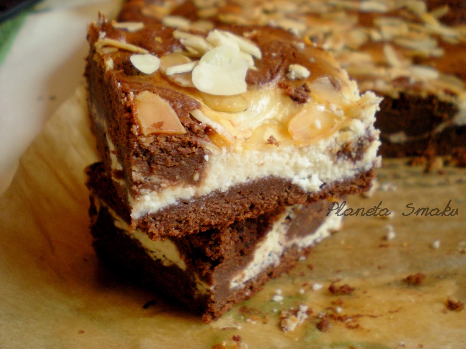 Blachę, najlepiej o wym. 24×24 cm wyłożyć papierem do pieczenia. Rozsmarować na nim 3/4 ciasta czekoladowego. Na to wylać masę serową i ponownie przykryć ciastem (jeśli będzie to trudne, można pozostawić „kleksy” lub zrobić esy-floresy, ciasto zyska oryginalny wygląd 🙂 ). Posypać płatkami migdałowymi. Piec przez ok. 50 minut w 170 stopniach, ostudzić, włożyć do lodówki (najlepiej na całą noc).