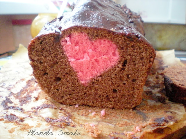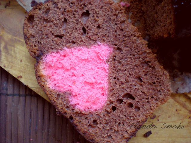 Z okazji zbliżających się Walentynek warto skusić się na upieczenie tego ciasta. Wbrew pozorom jest bardzo proste – to zwykły murzynek, który chyba zawsze się udaje. Zwykły-niezwykły, bo jeśli wszystko pójdzie zgodnie z planem, to w przekroju powinno pojawić się biszkoptowe serduszko. Znak, że włożyliście je (dosłownie!) w pieczenie 🙂