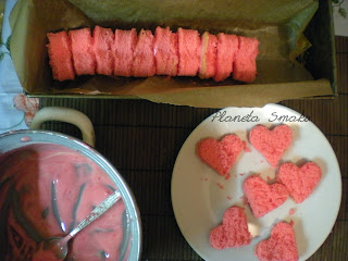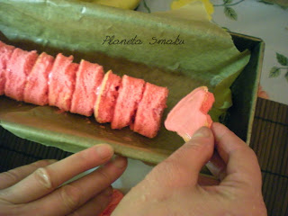 Serduszka zlepiać ze sobą, używając pozostawionego ciasta. Ułożyć je po środku keksówki, w jednym rządku.