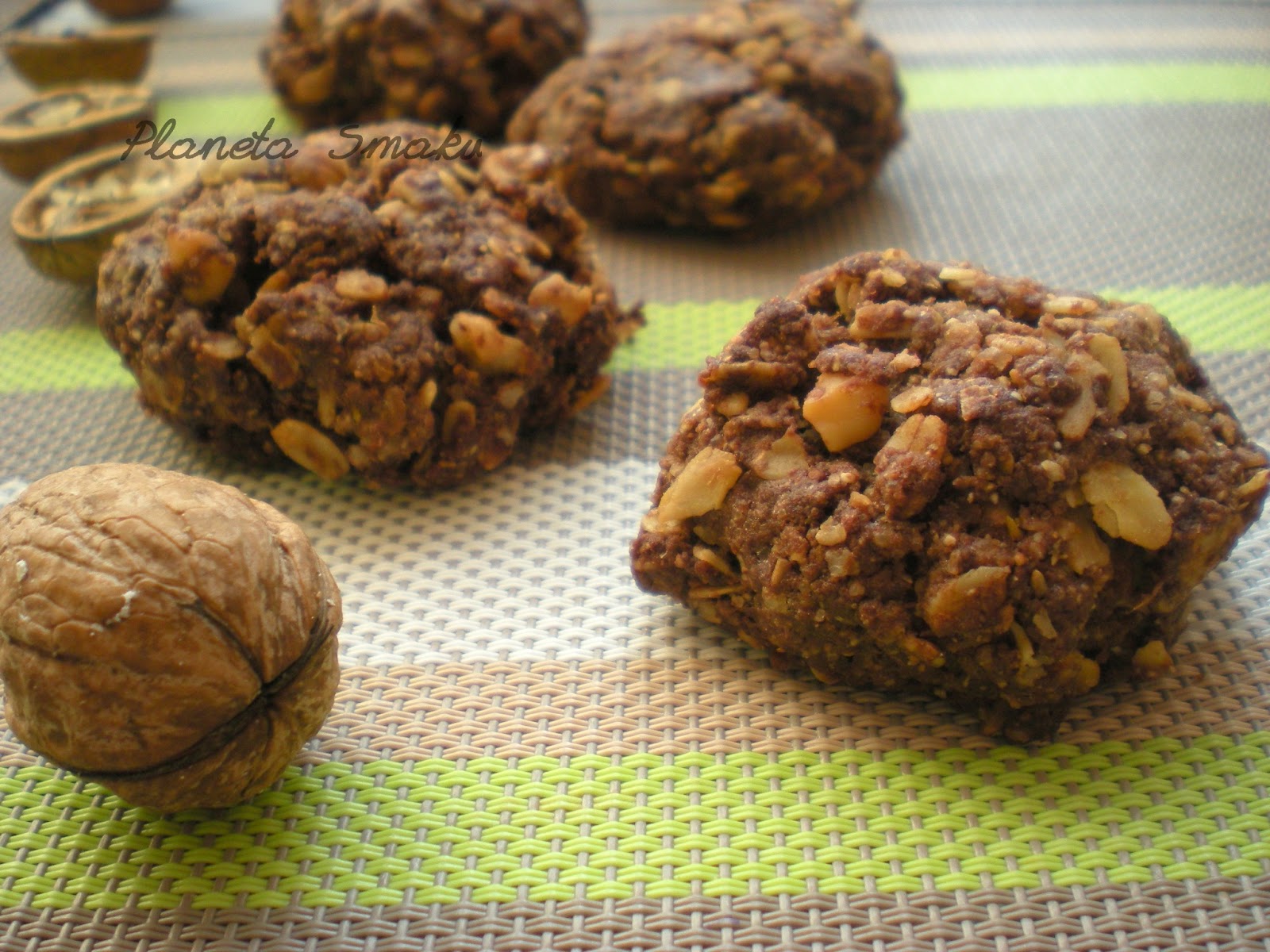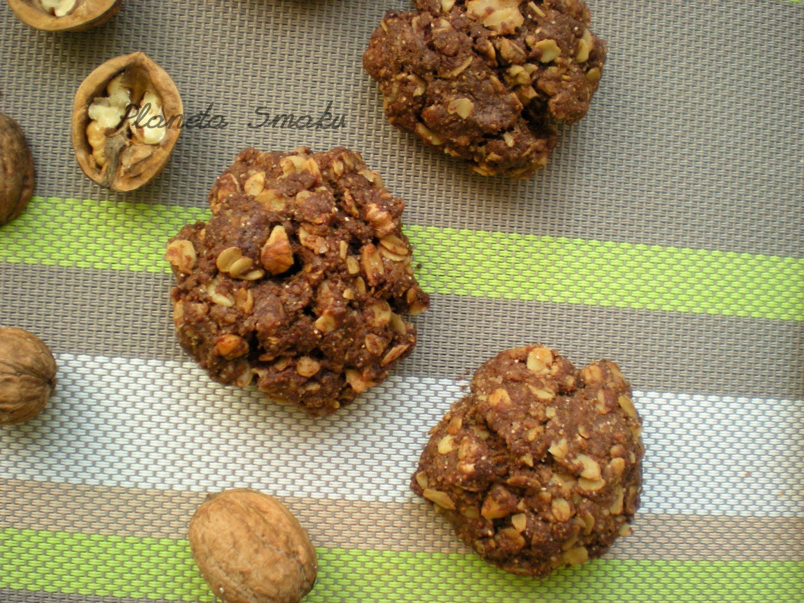 Do masy owsianej wsypać mąkę, sodę i proszek do pieczenia. Dodać jajko i białko, wyrobić rękami aż do połączenia składników. Wsypać posiekaną czekoladę. Formować z masy kuleczki, lekko je rozpłaszczać, wykładać na blasze wyłożonej papierem do pieczenia.