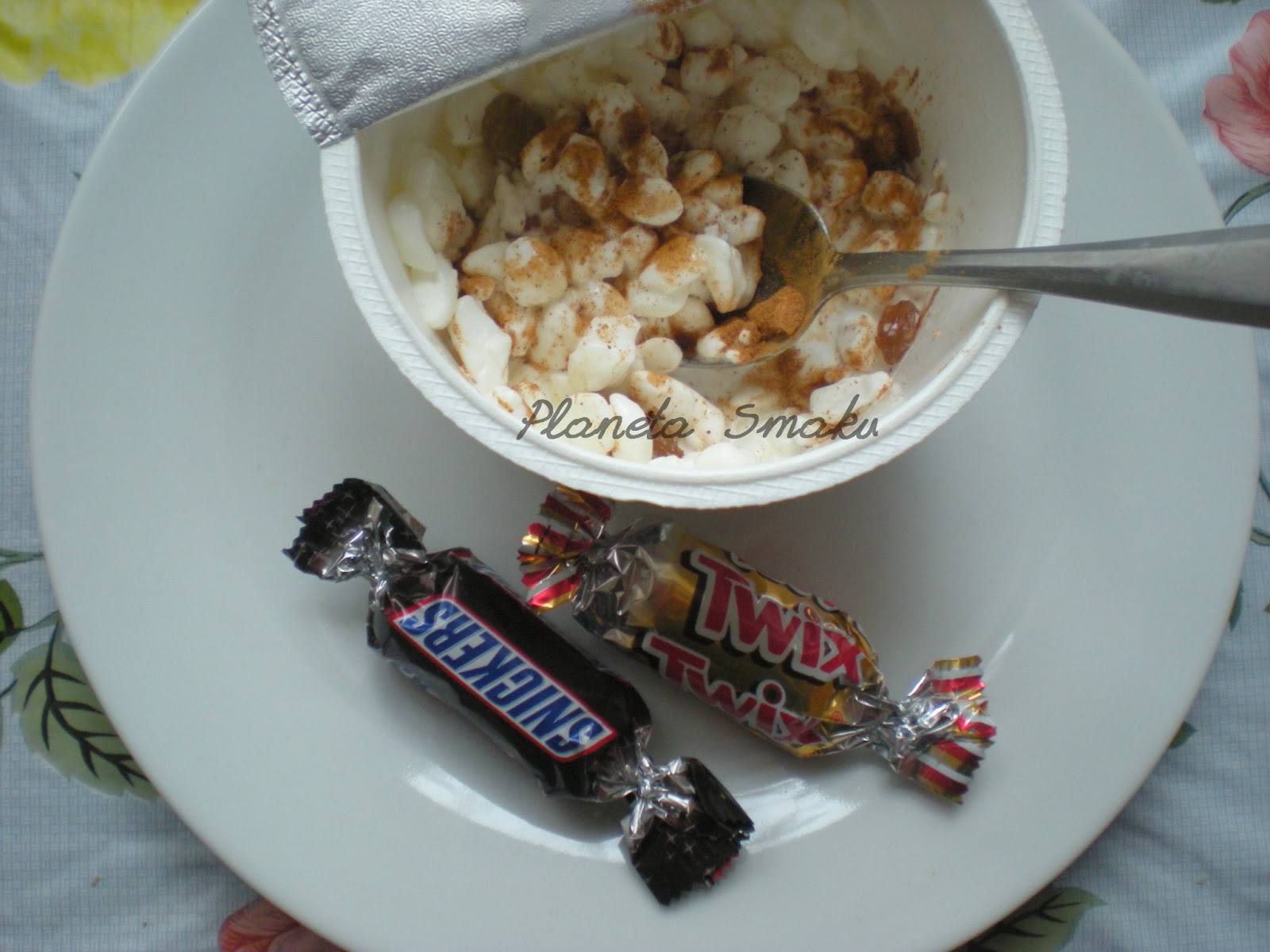serek wiejski z rodzynkami i cynamonem, cukierki Snickers i Twix
