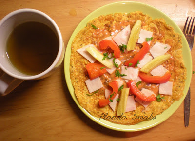 omlet z dwóch jaj z dodatkiem łyżki sosu pomidorowego (z obiadu), podany z szynką drobiową, ogórkiem w zalewie musztardowej oraz papryką.