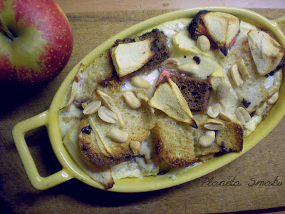 Chleb pokroić w kostkę, ułożyć połowę w wysmarowanej masłem foremce do zapiekania. Jajko roztrzepać z mlekiem, cukrem i miodem. Na chlebie ułożyć plasterki jabłka, polać masą i ułożyć resztę chleba. Można dodatkowo położyć na górę parę plasterków jabłka. Posypać orzechami, wstawić do lodówki na ok. 20 minut (ja nie czekałam). Piec przez ok. 30 minut w 180 stopniach.