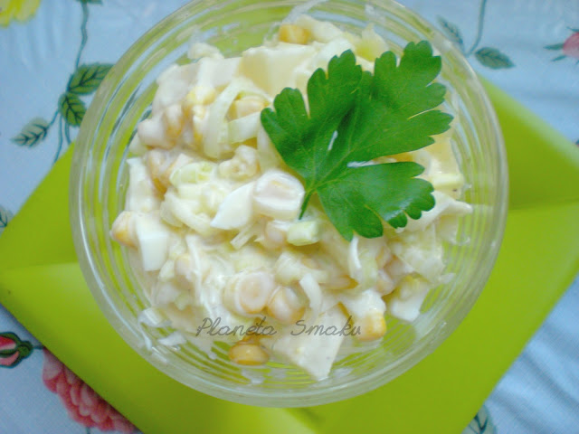 Białą część pora pokroić w cienkie krążki, posolić, odstawić by trochę zmiękł. Jajka ugotować na twardo, ostudzić, pokroić w drobną kostkę. Selera i kukurydzę bardzo dobrze odsączyć. Ananasa również odsączyć z zalewy – jeśli kupiliśmy takiego w plastrach, pokroić je na drobniejsze kawałki. Ser żółty pokroić w dość drobną kostkę. Wszystkie składniki wymieszać w dużej misce, dodać majonez i jogurt naturalny, doprawić solą i pieprzem.