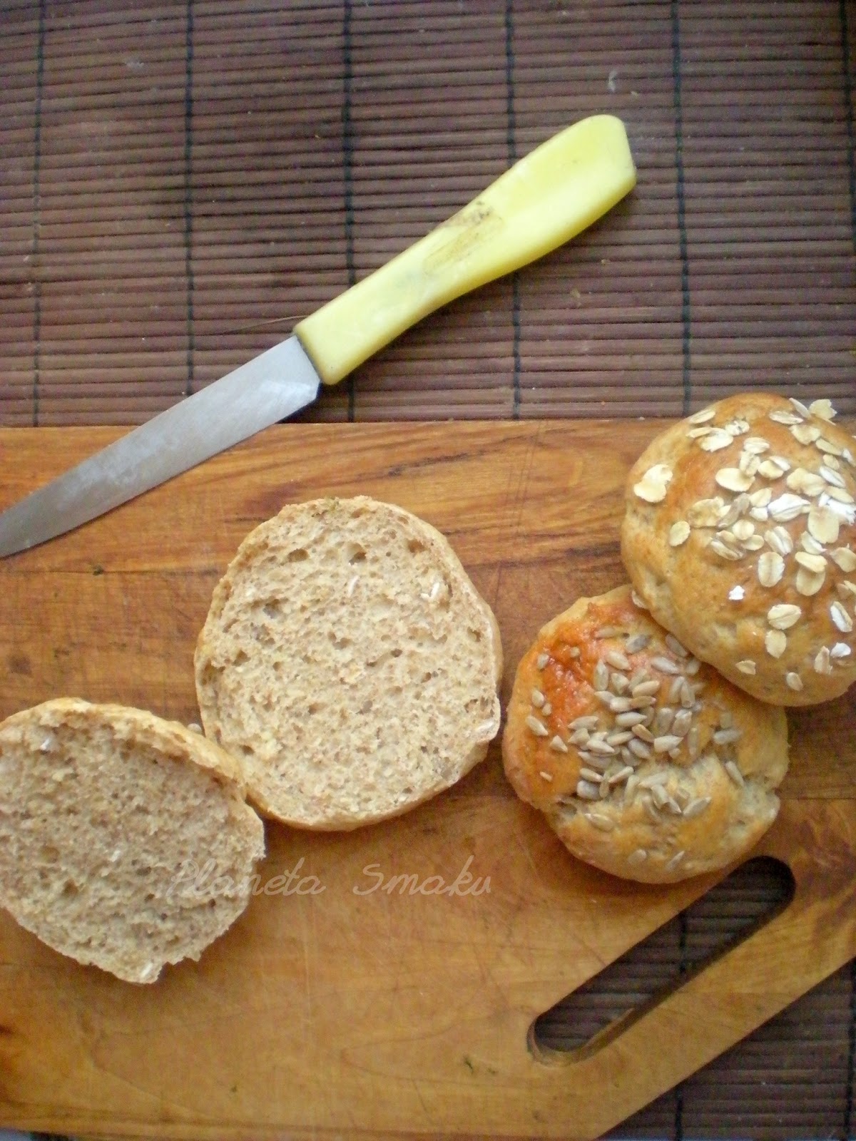 Piekarnik nagrzać do 175 stopni C. Bułeczki posmarować roztrzepanym białkiem i posypać płatkami zbożowymi. Ustawić na środkowej kratce w nagrzanym piekarniku i piec przez ok. 30 minut na złoty kolor.