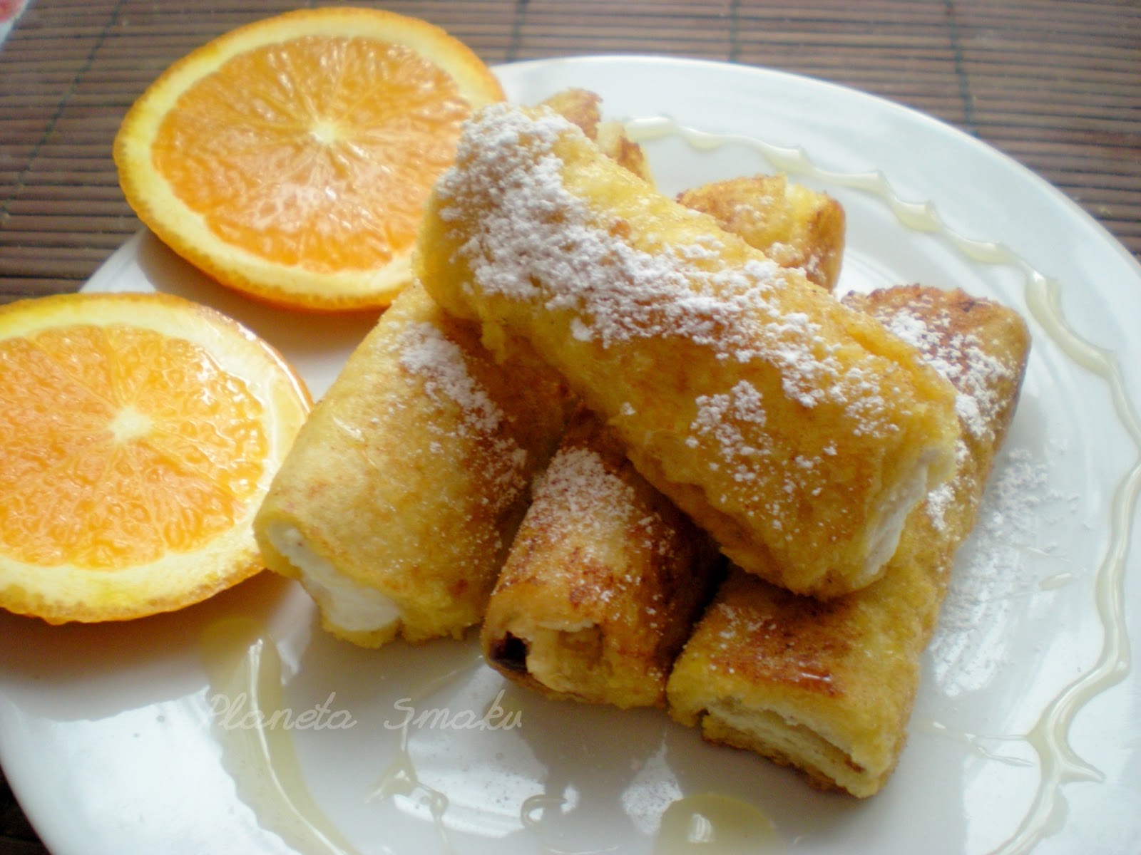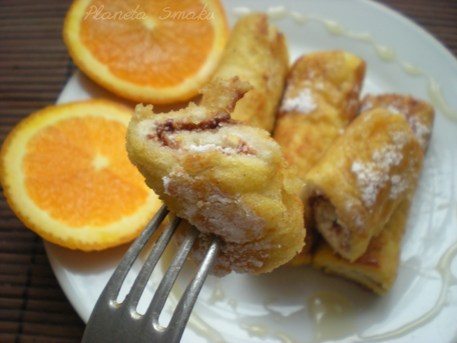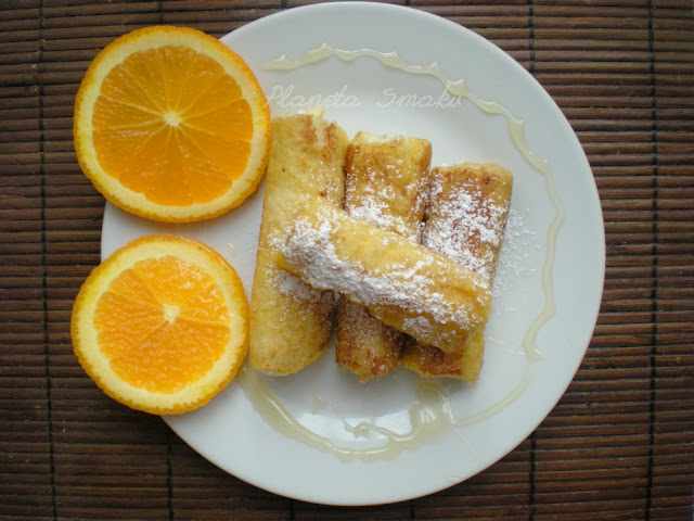 Zwinąć w dość ciasną roladkę. Aby nie rozwinęła się na patelni, można każdą dodatkowo obwiązać nitką dookoła, choć nie jest to konieczne. Każdą roladkę obtoczyć w jajku roztrzepanym z 2 łyżkami mleka i cukrem. Na patelni rozgrzać masło. Smażyć tostowe roladki z każdej strony, aż nabiorą złotego koloru.
