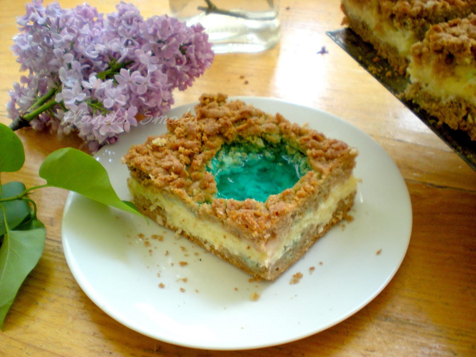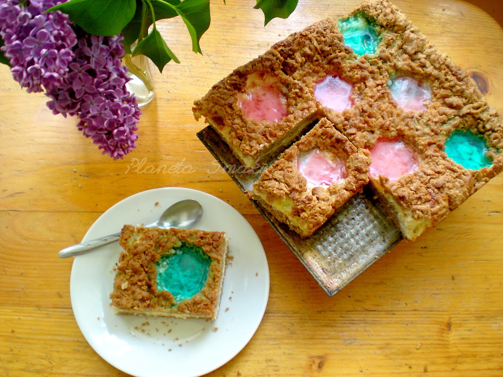Połączenie kruchego ciasta z masą, która smakuje jak coś pomiędzy budyniem i sernikiem. Do tego otworki wypełnione galaretką na wierzchu. Uwierzcie mi, chyba nie da się nie lubić tego ciasta.
