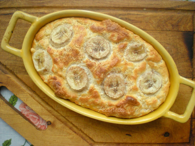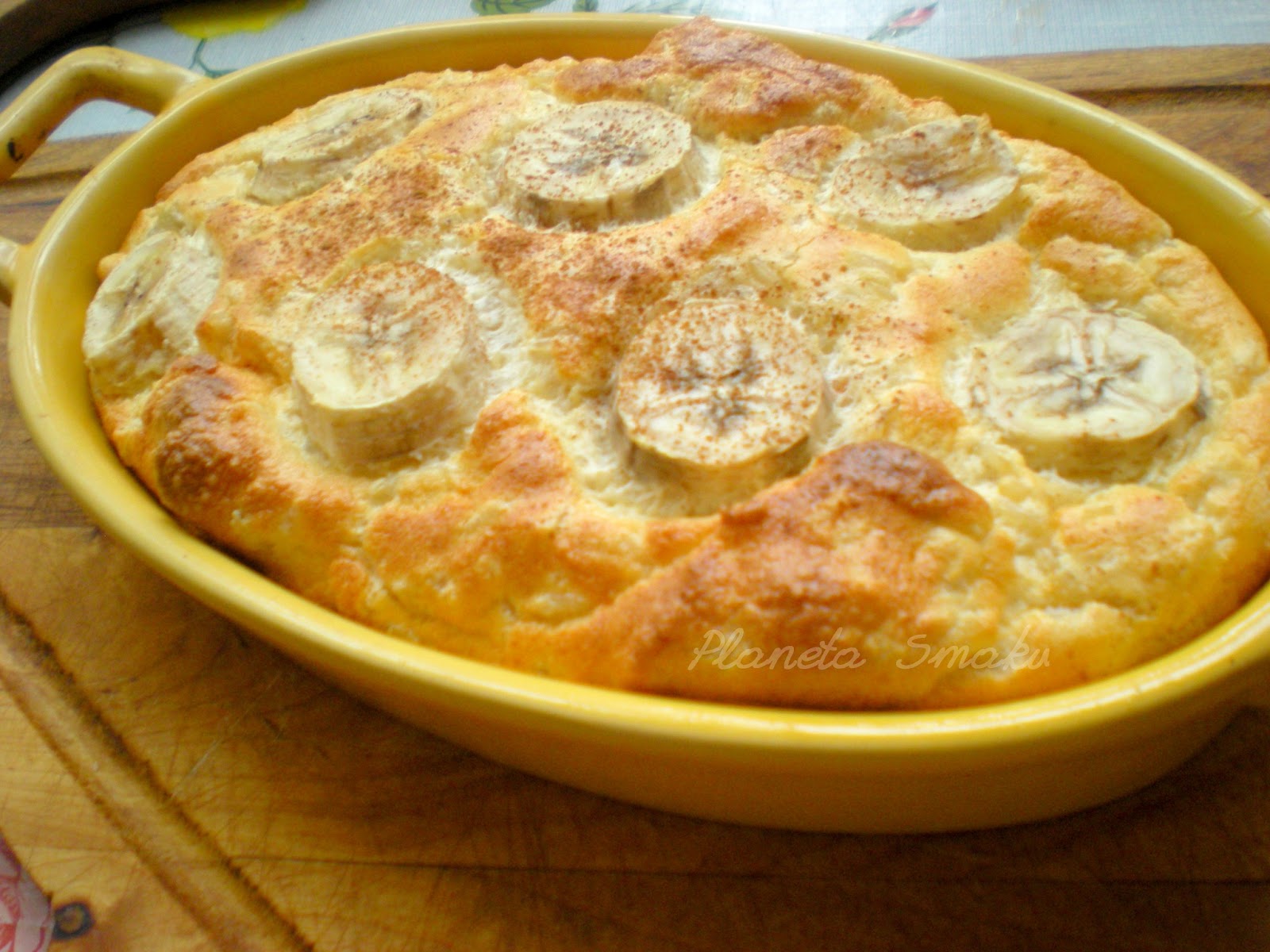 Białko ubić na sztywną pianę. W osobnej misce zmiksować ryż z żółtkiem, jogurtem, masłem orzechowym, cynamonem i cukrem. Delikatnie wymieszać z pianą z białek. Przełożyć do naczynka do zapiekania wysmarowanego odrobiną tłuszczu, ułożyć pokrojone plasterki banana. Wstawić do piekarnika nagrzanego do 180 stopni i piec przez 25 – 30 minut.
