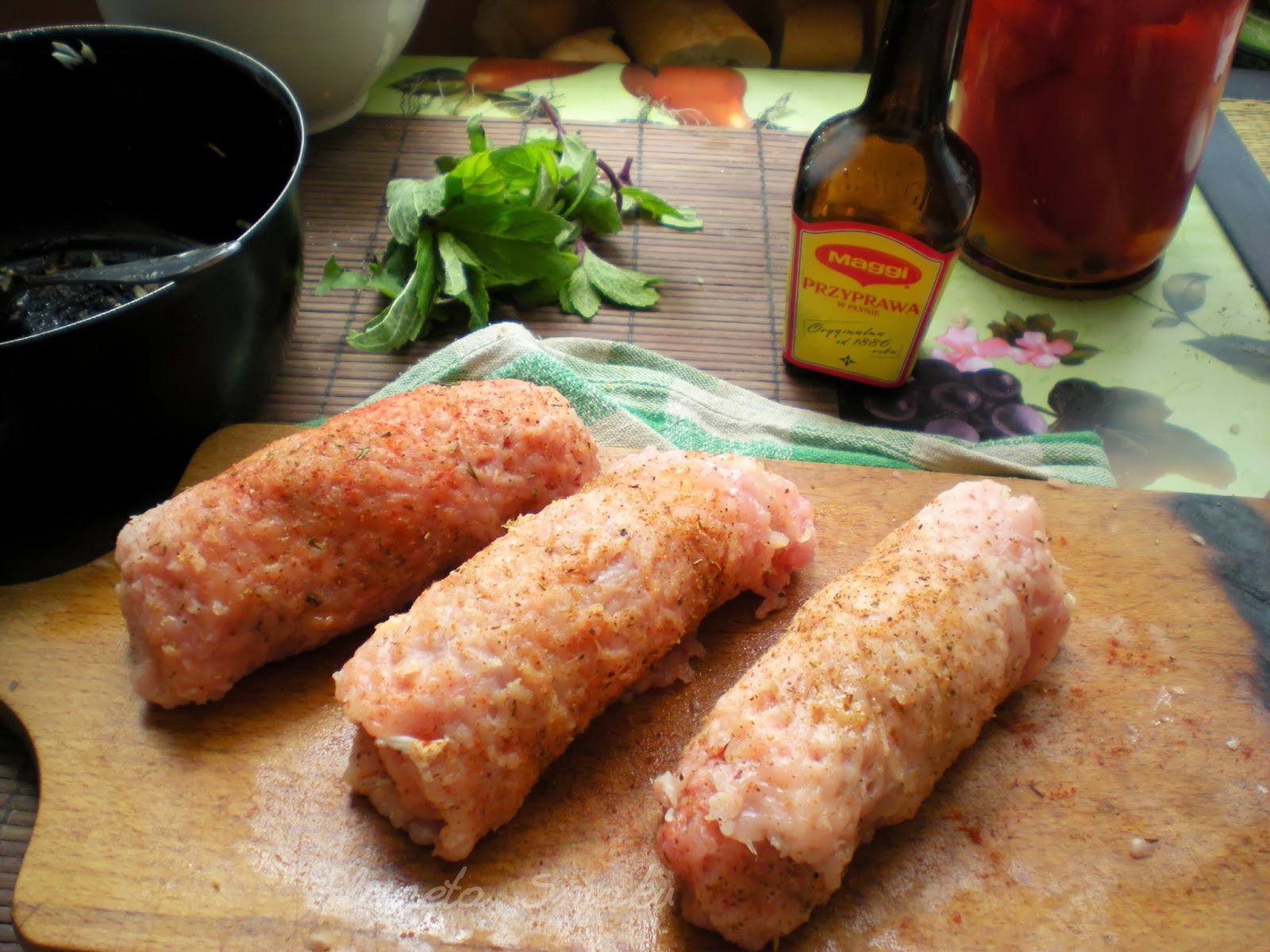 Plastry schabu bardzo cienko rozbić. Przyprawić pieprzem, papryką słodką, tymiankiem i Maggi, z obu stron.