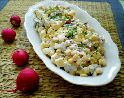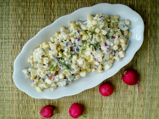 Pieczarki obieramy, kroimy w kostkę i wrzucamy na wrzącą, osoloną wodę. Gotujemy przez około 5 minut, aż będą miękkie. Odcedzamy je i odstawiamy do ostygnięcia. Jajka i ser kroimy w kostkę. Cebulę (lub pora) siekamy. Dodajemy kukurydzę lub fasolę. Doprawiamy do smaku solą i pieprzem, mieszamy z majonezem.