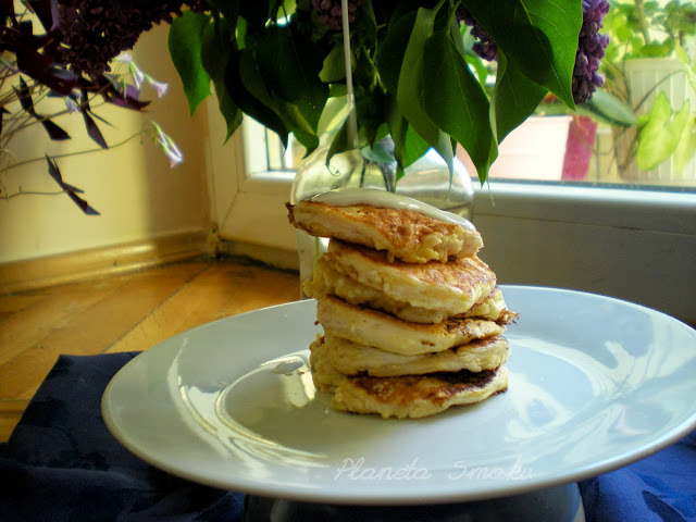 Białka ubić na sztywną pianę. Żółtka utrzeć z cukrem i serem, dodać mąkę, proszek do pieczenia, wiórki kokosowe i aromat. Delikatnie wymieszać z pianą z białek. Na patelni rozgrzać odrobinę masła, nakładać po łyżce ciasta. Smażyć placuszki z dwóch stron na złoty kolor.