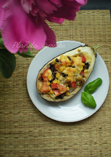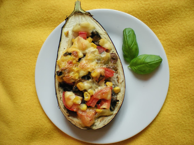Bakłażana osuszyć papierowym ręcznikiem. Na każdą połówkę nałożyć ryż, pieczarki z cebulką, kukurydzę i pokrojonego w kostkę pomidora. Przykryć startym lub pokrojonym żółtym serem. Zapiekać przez pół godziny w 180 stopniach.