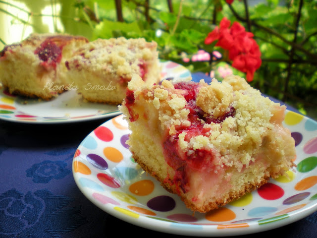 Gdy ciasto drożdżowe wyrośnie, ułożyć na nim umyte i osuszone owoce, posypać kruszonką. Wstawić do piekarnika nagrzanego do 160 stopni i piec przez 35-40 minut.