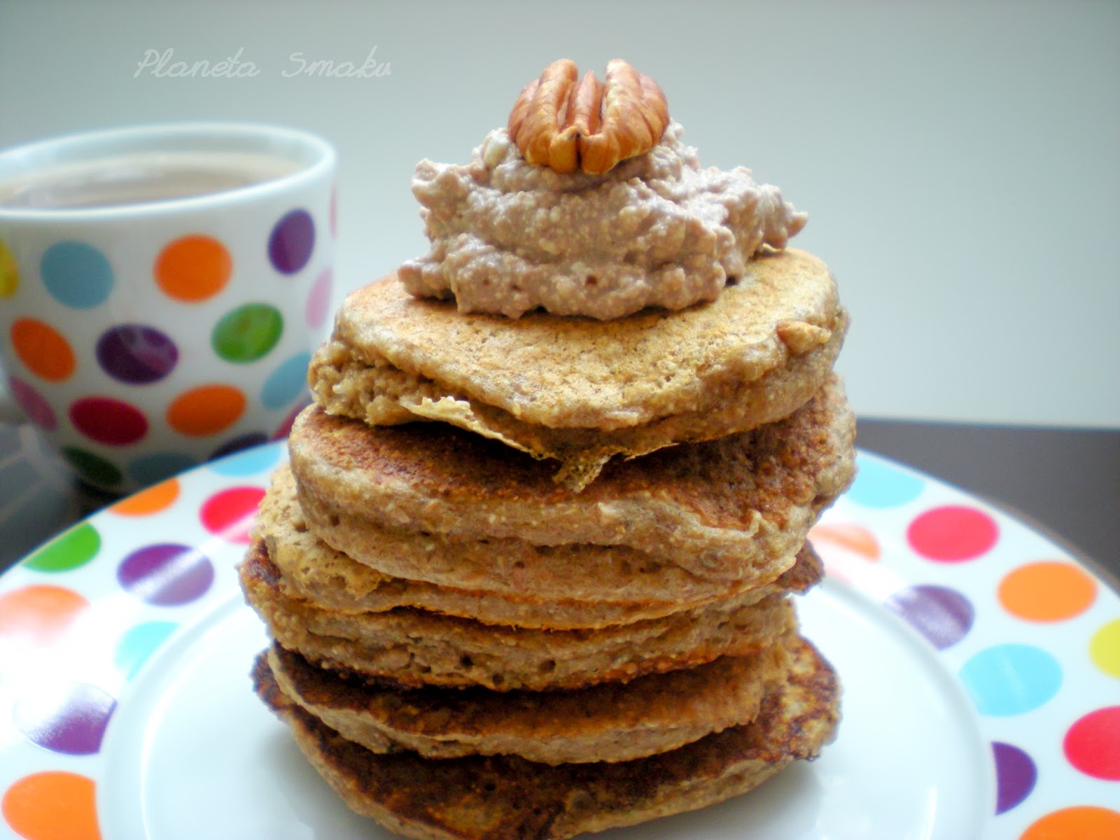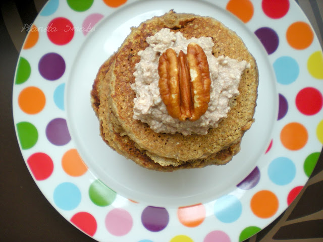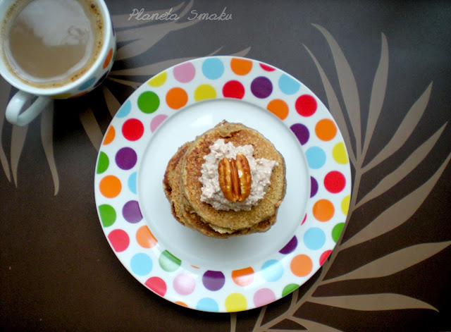 Smażyć małe placuszki na rozgrzanej teflonowej patelni. Podawać z ulubionymi dodatkami (u mnie twarożek z kakao i miodem oraz orzechy pecan).