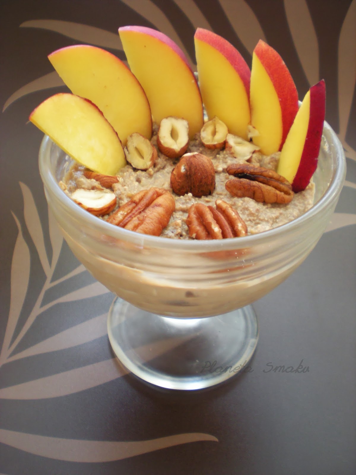 Orzechy laskowe zmielić lub drobno posiekać. Zmiksować razem z twarogiem i ostudzoną kaszą manną. Przełożyć do pucharka, dowolnie udekorować. Wstawić do lodówki, najlepiej na całą noc.