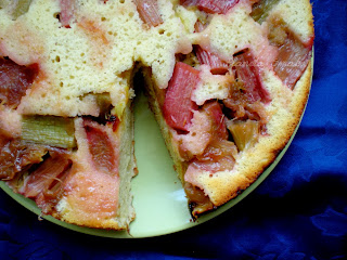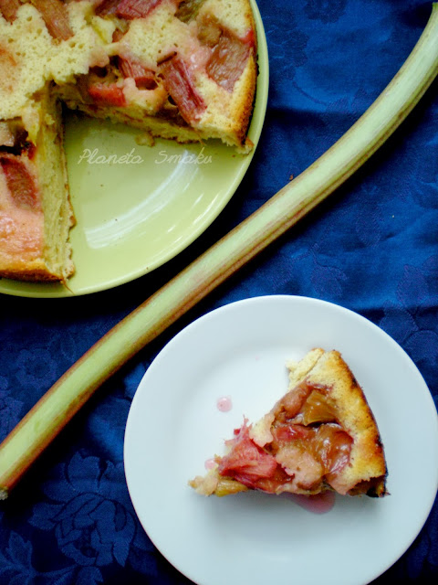 Masę wyłożyć łyżką na rabarbar, delikatnie rozsmarować ciasto wyrównując powierzchnię. Wstawić do nagrzanego piekarnika i piec przez około 30 minut, do czasu aż ciasto urośnie, a wierzch lekko się zrumieni.