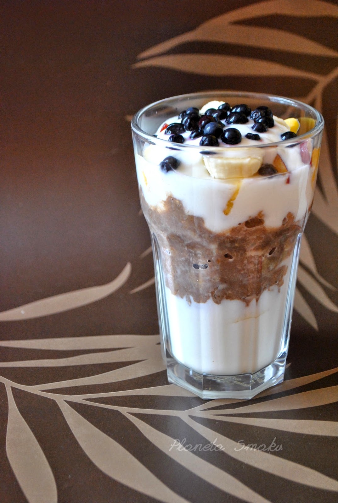 Do wysokiej szklanki wlać więcej niż połowę jogurtu. Ułożyć na nim plasterki banana, a na to warstwę kakaowych płatków. Przykryć kilkoma łyżkami jogurtu, ułożyć owoce, według własnej inwencji. Podawać od razu, by warstwy się nie zmieszały. Smacznego!