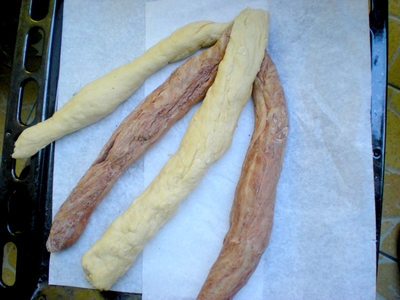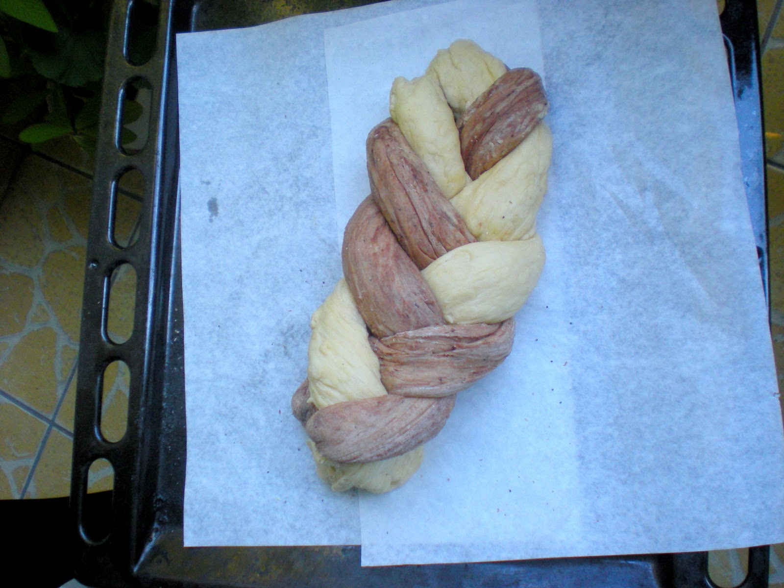 Po wyrośnięciu uderzyć ciasto pięścią (w celu odgazowania) i ponownie zagnieść. Podzielić na 4 części (2 z jasnej i 2 z ciemnej), z każdej uformować wałek tej samej długości. Zapleść z nich kłos, podwijając końce pod spód chałki.