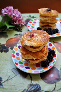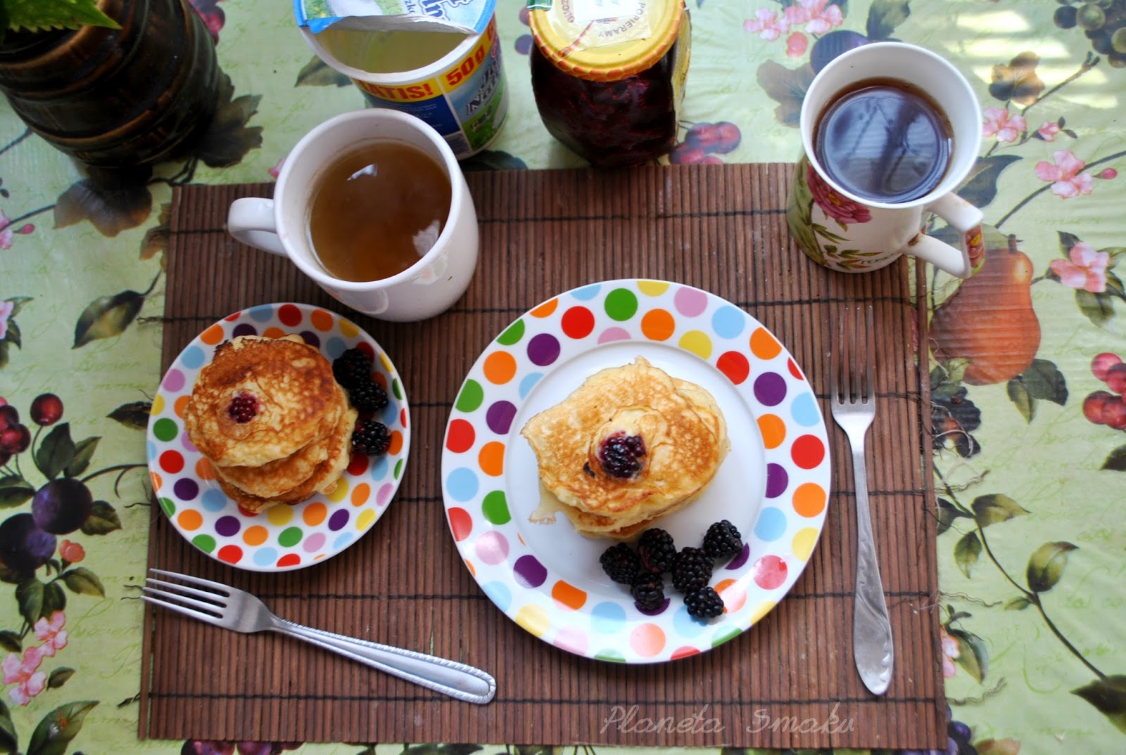 Minęło sporo czasu, kiedy po raz pierwszy wypróbowałam przepis na te placuszki. Zdążyłam zrobić je w naprawdę wielu wersjach: z truskawkami, jak w oryginale, z malinami, z bananem, z nektarynką i rodzynkami, a w końcu – z jeżynami. Po drodze wymyśliłam owsianą wersję tych placków, która bardzo przypadła mi do gustu. Przetestowane w tak wielu podejściach, zawsze były wysoko oceniane. A zjedzone w towarzystwie smakują najlepiej.