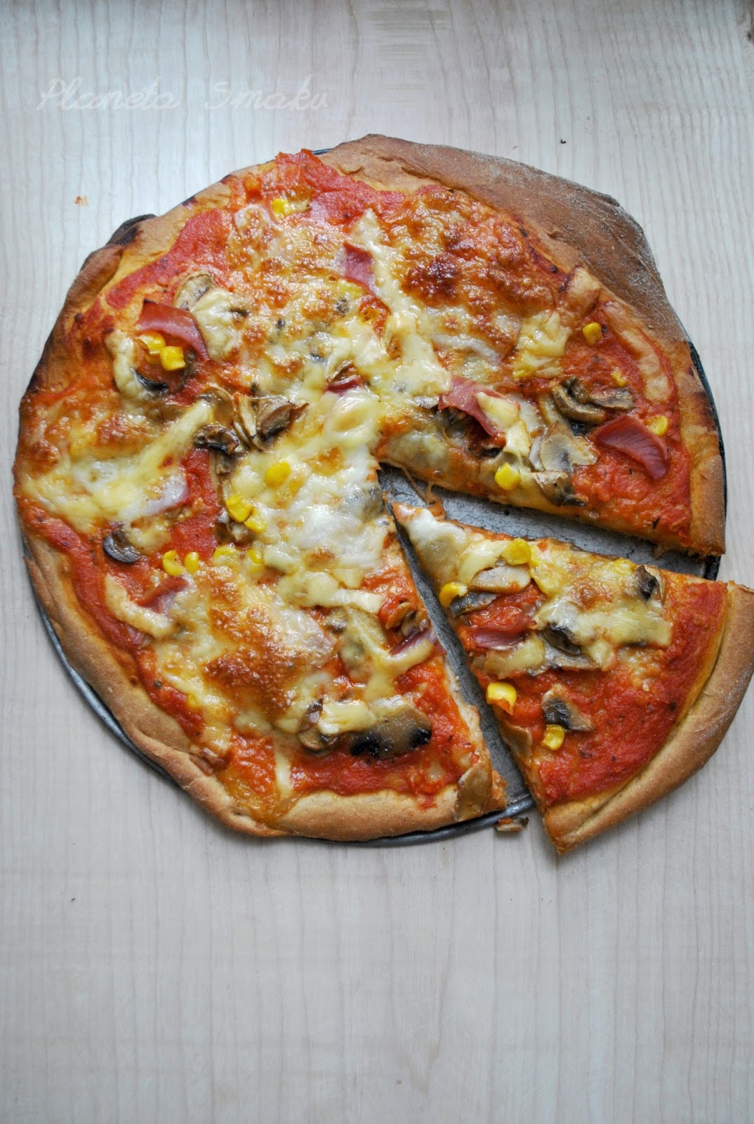 Po tym czasie podzielić ciasto na dwie części. Każdą cienko rozwałkować, podsypując mąką. Odstawić na 15 minut. Na cieście ułożyć dodatki: sos pomidorowy, podduszone pieczarki, ser, szynkę, kukurydzę – lub Wasze ulubione składniki. Wstawić do piekarnika nagrzanego do 200 stopni i piec przez ok. 20 minut, aż do zrumienienia.