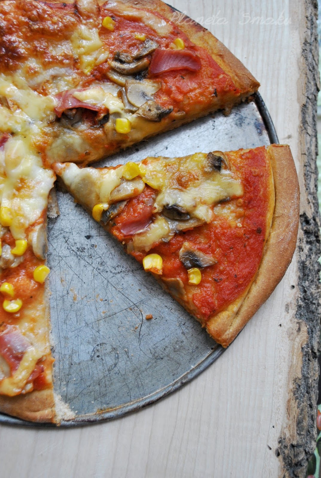 Nie tak dawno na Facebooku pisałam o domowej pizzy, więc dziś czas na przepis. Pochodzi on z książki Grzegorza Łapanowskiego „Smakuje”, którą otrzymałam będąc na warsztatach w SmArt Studio. Z ciastem pracuje się bardzo przyjemnie, jest plastyczne i rozciągliwe. Dodatek mąki razowej sprawia, że spód jest zdrowszy i bardziej chrupiący. Polecam, domowa pizza nie ma sobie równych!