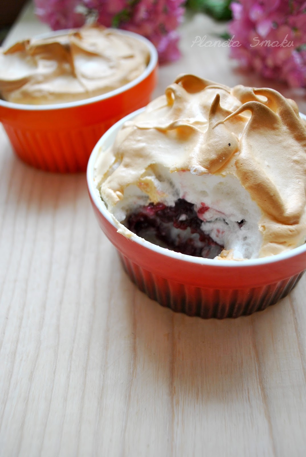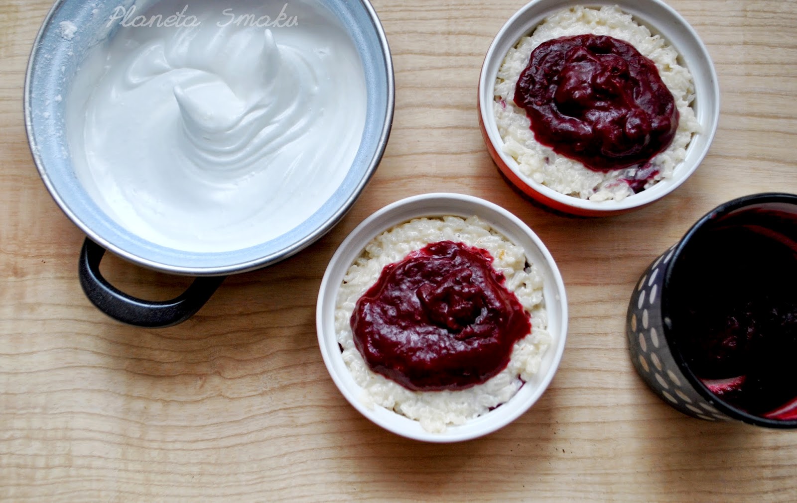 Gdybym chciała w tytule posta zawrzeć wszystkie informacje o tym puddingu, nie starczyłoby znaków. Ryż gotowany na mleku z dodatkiem wanilii i wiórek kokosowych, własnoręcznie przyrządzony budyń jeżynowy oraz chrupiąca z wierzchu i miękka w środku beza. Zapieczone w nowych kokilkach podbiły serca moje i mojej rodziny. To połączenie smaków jest wyjątkowo udane. Uwierzcie, warto zrobić te puddingi.