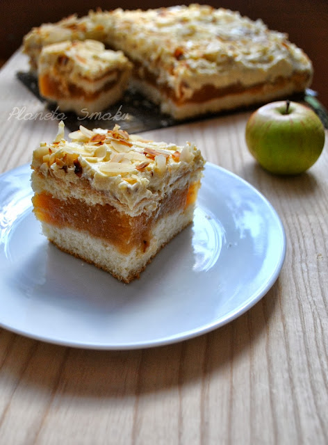 Uwielbiam przekopywać się przez stosy ręcznie spisanych przepisów, które zebrała moja mama. Zawsze wydają mi się interesujące. Głównie dlatego, że w przeciwieństwie do receptur znajdujących się w sieci i w książkach kucharskich, muszę użyć wyobraźni. Nie jestem pewna, jak ma wyglądać ostateczna potrawa, nie ma komentarzy, które polecają bądź nie polecają danego przepisu. Podejmuję więc poniekąd ryzyko, czasem wspierając się wspomnieniami z dzieciństwa. Tak jak z tym ciastem. Kiedy (dawno dawno temu…:D) moja mama wiodła prym w pieczeniu ciast, lubiła robić właśnie ten przekładany jabłkami biszkopt. Pamiętałam, że bardzo mi smakował. Postanowiłam zmienić trochę recepturę z wysłużonej kartki, dodając do masy budyniowej trochę masła orzechowego i zastępując wiórki kokosowe płatkami migdałowymi. Efekt? Jeszcze lepszy, niż zapamiętałam z dzieciństwa. Tradycja i nowoczesność w jednym cieście. Takie połączenia są niezwykle udane.