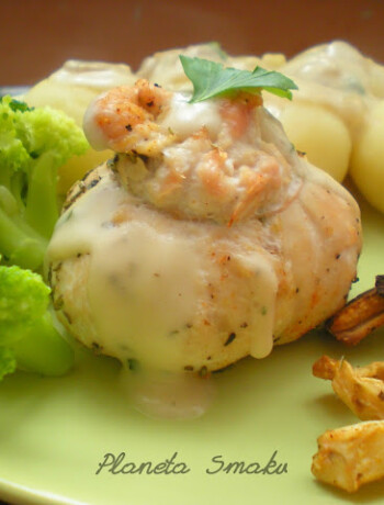 Jedną część biszkoptu posmarować masą jabłkową. Przykryć drugim blatem ciasta. Wyłożyć na to masę budyniową, posypać płatkami migdałowymi. Wstawić do lodówki na kilka godzin, najlepiej na noc.