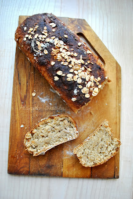 Ciasto przełożyć na oprószoną mąką stolnicę i wyrabiać przez 10 minut. Uformować podłużny chlebek i przełożyć do formy wyłożonej papierem do pieczenia. Wierzch chleba posmarować lekko olejem, posypać płatkami owsianymi lub ziarnami. Foremkę przykryć folią i odstawić do lodówki przynajmniej na 8 godzin. Wyjąć z lodówki na około 10 minut przed pieczeniem.