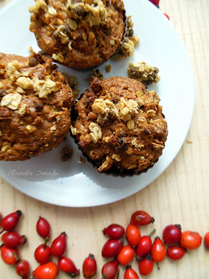 Do suchych składników wlać mokre. Dodać obraną i pokrojoną w kostkę gruszkę oraz granolę, wymieszać łyżką do połączenia składników. Przygotowanym ciastem wypełniać foremki do muffinek, posypać je granolą. Wstawić do nagrzanego do 180 stopni piekarnika i piec przez ok. 25 minut.