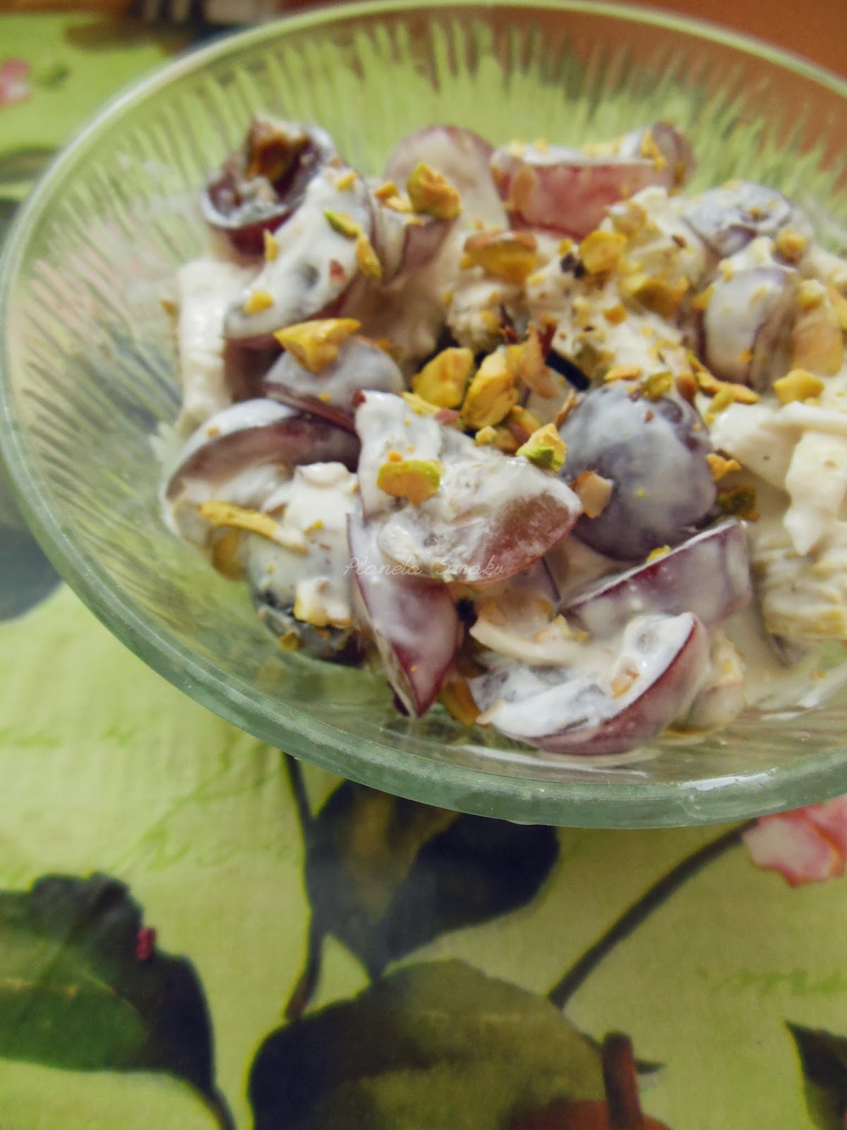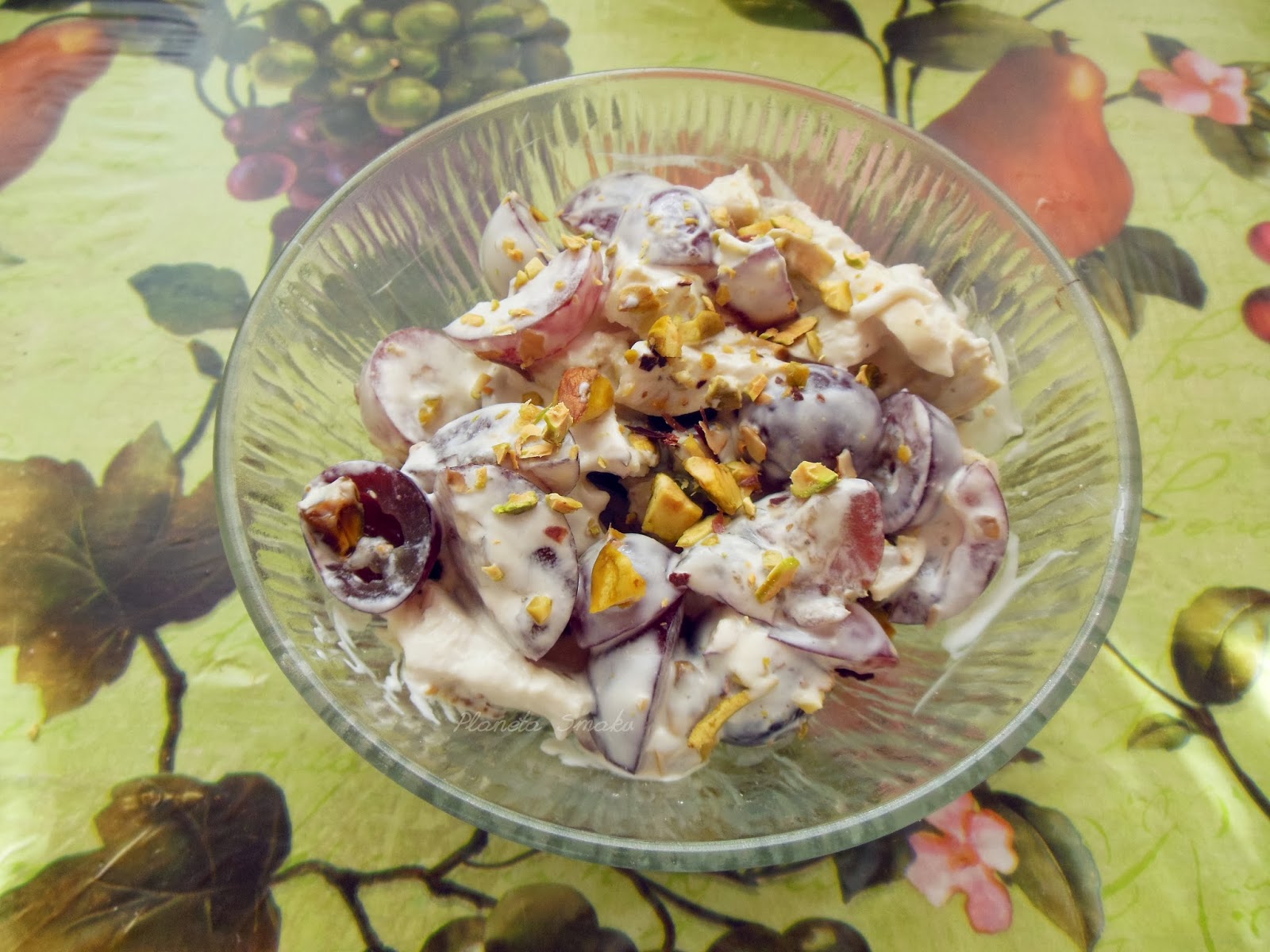 Po raz kolejny przekonałam się, że ilość nie równa się jakość. Trzy główne składniki wystarczyły, by stworzyć naprawdę pyszną sałatkę, której nie wstydziłabym się podać na świątecznym stole. Co takiego zawiera? Czerwone winogrona, gotowaną pierś z kurczaka i… pistacje. To tyle! Jest jeszcze jogurt grecki połączony z majonezem. Prostota tym razem wychodzi jak najbardziej na plus. Ciekawi smaku? Koniecznie zróbcie. Mnie bardzo posmakowała.
