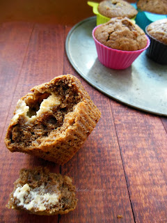 W misce wymieszać rozpuszczone i ostudzone masło z cukrem i cukrem waniliowym, dodać jajko, letnią kawę oraz mleko. Wymieszać. W drugiej misce wymieszać składniki suche: mąkę, proszek do pieczenia i sól. Wlać mokre składniki do suchych i wymieszać do połączenia składników. Mogą pozostać grudki. Napełniać foremki do połowy, włożyć kawałek chałwy i przykryć masą.