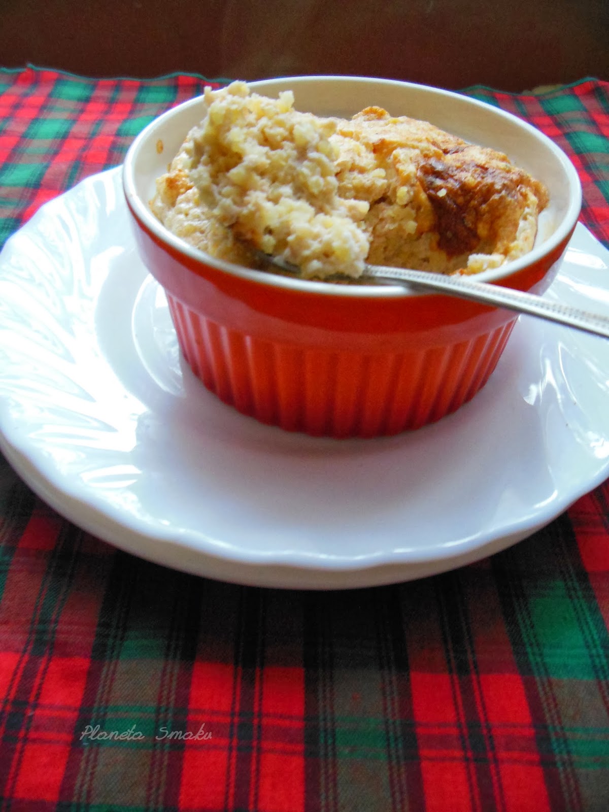 Białko ubić na pianę, delikatnie połączyć z masą. Całość przełożyć do natłuszczonej kokilki i piec przez 20 minut, aż do zrumienienia wierzchu.
