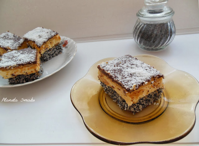Białka ubić na sztywną pianę ze szczyptą soli. Stopniowo dodawać cukier. Pod koniec ubijania wsypać mak i wiórki, delikatnie wymieszać szpatułką. Ciasto wylać na wyłożoną papierem do pieczenia blachę. Piec przez ok.30 min. w 170 stopniach. Wyjąć z piekarnika, całkowicie ostudzić.
