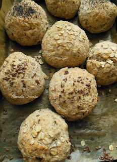 Po tym czasie lekko wyrobić ciasto. Odrywać kulki mniejsze od pięści, posmarować odrobiną oliwy i posypać dowolnymi ziarnami. Odstawić na 30 minut pod przykryciem, po czym wstawić do nagrzanego piekarnika (190 stopni) i piec przez ok. 20-25 minut, aż będą rumiane.